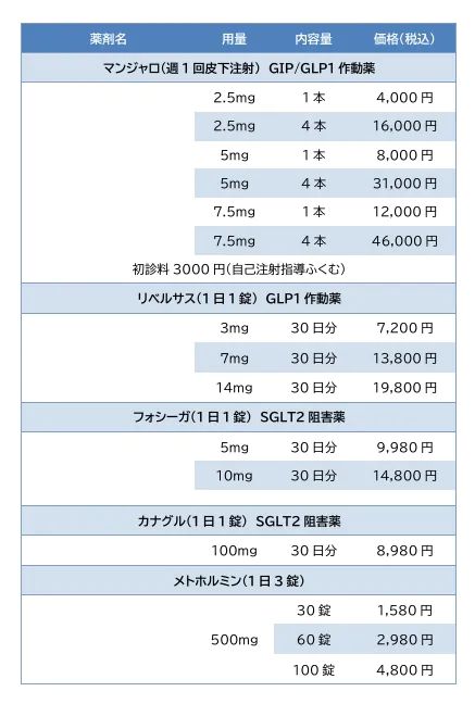 メディカルダイエットとしてGIP/GLP-1作動薬であるチルゼパチド(マンジャロ)の皮下注射の処方を行っています。注射が苦手な方にはセマグルチド(リベルサス)内服薬の処方も行っています。またSGLT2阻害薬であるダパグリフロジン(フォシーガ) 内服薬およびカナグリフロジン(カナグル) 内服薬もあります。